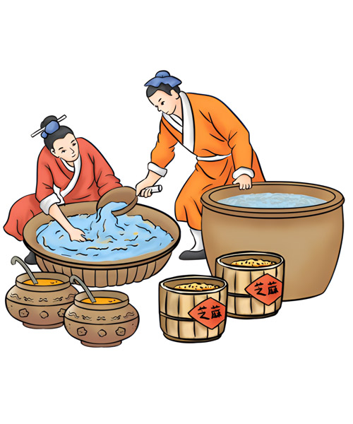 - 芝麻經過漂洗浸泡,既清除了芝麻中的并肩泥等雜質,又讓水分充分滲透到完整細胞內部,使凝膠體膨脹,再經過加熱炒籽,就可以使細胞破裂,油體原生質流出。