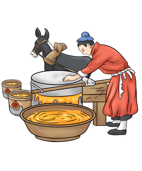 - 將炒好的芝麻用石磨磨成芝麻醬。芝麻醬磨的越細越好,使油料細胞充分破裂,以便取出油脂。